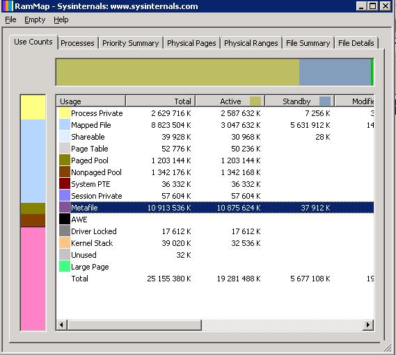 The actual data on RAM usage can be obtained with the help of small utility – ?RAMMap (by Mark Russinovich). Download the archive containing the tool and run RAMMap.exe with the administrator privileges. In the Use Counts tab, we see that Metafile is using the largest amount of RAM. (In our case, it is using 11 from 25 GB of the server RAM).