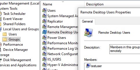Add-LocalGroupMember -Group "Remote Desktop Users" -Member testuser