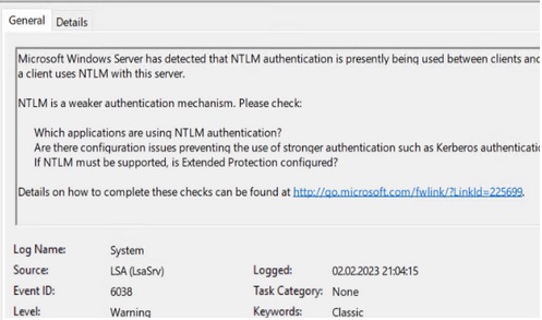 Microsoft Windows Server has detected that NTLM authentication is presently being used between clients and this server. This event occurs once per boot of the server on the first time a client uses NTLM with this server. NTLM is a weaker authentication mechanism. Please check: Which applications are using NTLM authentication? Are there configuration issues preventing the use of stronger authentication such as Kerberos authentication? If NTLM must be supported, is Extended Protection configured?