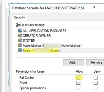 MACHINE\SOFTWARE\Microsoft\Windows\CurrentVersion\DriverSearching); - Set the new ACL settings for your registry key that you want to apply in the Database Security window. In this example, I want to allow users to make any changes to the system-protected registry key. You need to select the Users group and grant Full Control permission for it. You can enable the inheritance of permissions to the sub-keys by using the Advanced -> Enable inheritance option;?You can add or remove any other security groups, users, and other principals from the local computer or Active Directory.