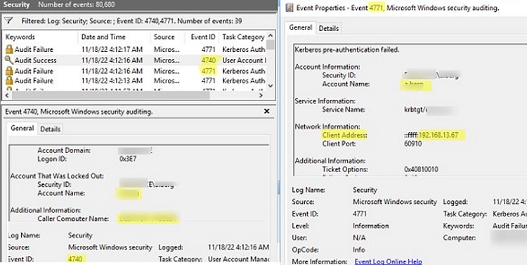 Open the Event Viewer -> Security log and enable the filter on Event IDs 4740 and 4741. Notice that now before the user lockout event (4740) occurs, the event 4771 (Kerberos Authentication Failed) from the Kerberos Authentication Service appears. It contains the name of the user who tried to authenticate and the IP address of the device (field Network Information -> Client Address) from which the auth request came.