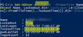 The user account is now locked (Lockedout = True) and cannot be used for authentication in the domain. Also in the output of the command, you can see information about the last time the user’s password was changed in the domain and the time the account was locked out.