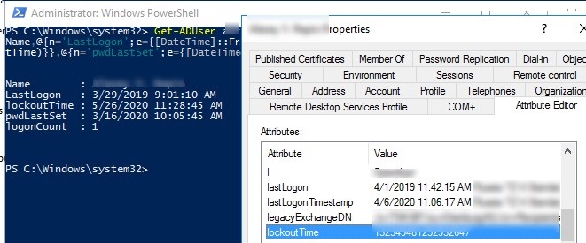 Get-ADUser jsmith -Properties Name,Lockedout, lastLogonTimestamp,lockoutTime,logonCount,pwdLastSet | Select-Object Name, Lockedout,@{n='LastLogon';e={[DateTime]::FromFileTime($_.lastLogonTimestamp)}},@{n='lockoutTime';e={[DateTime]::FromFileTime($_.lockoutTime)}},@{n='pwdLastSet';e={[DateTime]::FromFileTime($_.pwdLastSet)}},logonCount