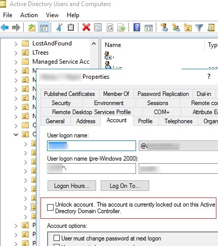 You can manually unlock an account using the ADUC console without waiting till it is unlocked automatically. Find the user account in AD (use the search option in AD snap-in), right-click, and select Properties. Go to the Account tab and check the box Unlock account. This account is currently locked out on this Active Directory Domain Controller. Click OK.