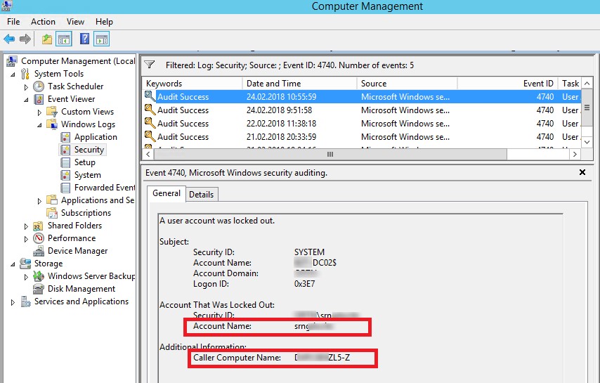 Open this event. The name of the computer (server) from which the account lockout event was logged is specified in the Caller Computer Name field. In this case, the computer’s name is DACZCZL5-Z.