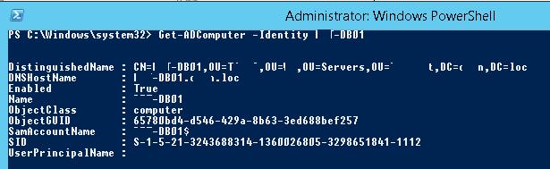 DistinguishedName : CN=SRV-DB01,OU=Servers,OU=London,OU=UK,DC=woshub,DC=com DNSHostName?????? : SRV-DB01.woshub.com Enabled?????????? : True Name????????????? : SRV-DB01 ObjectClass?????? : computer ObjectGUID??????? : 87654321-1234-5678-0000-123412341234 SamAccountName??? : SRV-DB01$ SID?????????????? : S-1-5-21-123456780-1234567890-0987654321-1234 UserPrincipalName :
