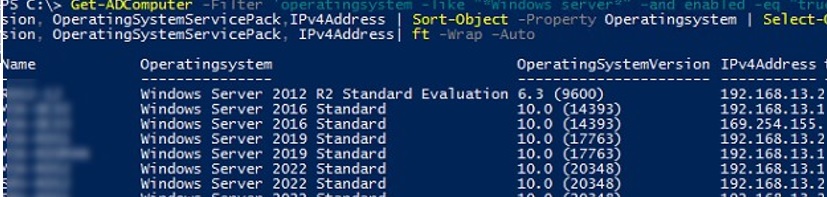 Get-ADComputer -Filter 'operatingsystem -like "*Windows server*" -and enabled -eq "true"' -Properties ?Name,Operatingsystem, OperatingSystemVersion, OperatingSystemServicePack,IPv4Address | Sort-Object -Property Operatingsystem | Select-Object -Property Name,Operatingsystem, OperatingSystemVersion, OperatingSystemServicePack, IPv4Address| ft -Wrap –Auto