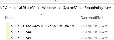 When an administrator creates a new Local Policy for a specific local user or group (MLGPO), a separate folder is created for that GPO in the C:\Windows\System32\GroupPolicyUsers directory. The SID of the user or group is used as the directory name. For example: