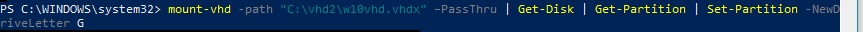 mount-vhd -path C:\vhd\win10vhd.vhdx –PassThru | Get-Disk | Get-Partition | Set-Partition -NewDriveLetter G