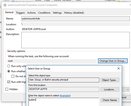 To run the task on behalf of SYSTEM, open its properties again and in the General tab click Change User or Group button. In Select User or Group Window specify system and save the changes.