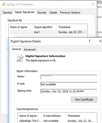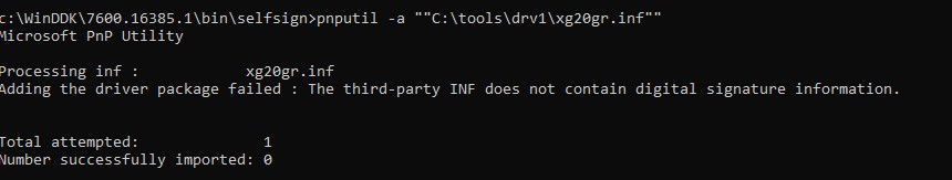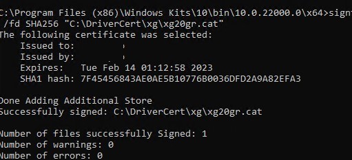 Successfully signed: C:\DriverCert\xg\xg20gr.cat Number of files successfully Signed: 1