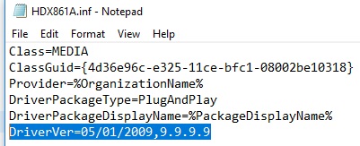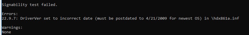 Signability test failed. Errors: 22.9.7: DriverVer set to incorrect date (must be postdated to 4/21/2009 for newest OS) in \hdx861a.inf