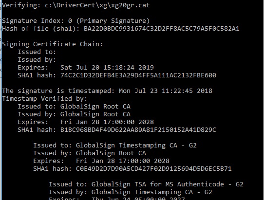 SignTool verify /v /pa c:\DriverCert\xg\xg20gr.cat