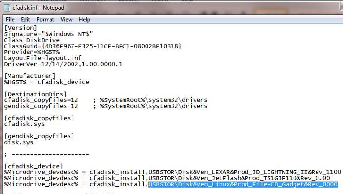 Suppose we are going to install a driver on the 64-bit system.? To edit it, open cfadisk.inf in any text editor. We need the sections cfadisk_device and cfadisk_device.NTamd64.