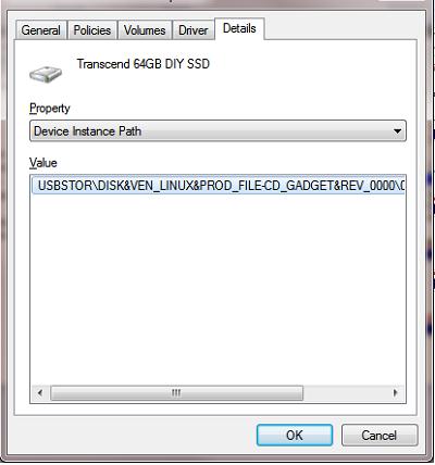 4. After rebooting get the ‘Device Instance Path’ of the new disk drive. With the changed instance again update the cfadisk.inf file.