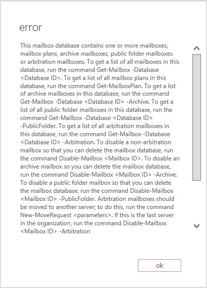 This mailbox database contains one or more mailboxes, mailbox plans, archive mailboxes, public folder mailboxes or arbitration mailboxes. To get a list of all mailboxes in this database, run the command Get-Mailbox -Database <Database ID>. To get a list of all mailbox plans in this database, run the command Get-MailboxPlan. To get a list of archive mailboxes in this database, run the command Get-Mailbox -Database <Database ID> -Archive. To get a list of all public folder mailboxes in this database, run the command Get-Mailbox -Database <Database ID> -PublicFolder. To get a list of all arbitration mailboxes in this database, run the command Get-Mailbox -Database <Database ID> -Arbitration. To disable a non-arbitration mailbox so that you can delete the mailbox database, run the command Disable-Mailbox <Mailbox ID>. To disable an archive mailbox so you can delete the mailbox database, run the command Disable-Mailbox <Mailbox ID> -Archive. To disable a public folder mailbox so that you can delete the mailbox database, run the command Disable-Mailbox <Mailbox ID> -PublicFolder. Arbitration mailboxes should be moved to another server; to do this, run the command New-MoveRequest <parameters>. If this is the last server in the organization, run the command Disable-Mailbox <Mailbox ID> -Arbitration -DisableLastArbitrationMailboxAllowed to disable the arbitration mailbox. Mailbox plans should be moved to another server; to do this, run the command Set-MailboxPlan <MailboxPlan ID> -Database <Database ID>.