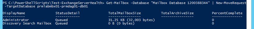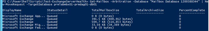 If such mailboxes are found, they must be moved using the following pipe: | New-MoveRequest -TargetDatabase DB3-02 (you can disable the Monitoring mailbox | Disable-Mailbox -Confirm:$false).