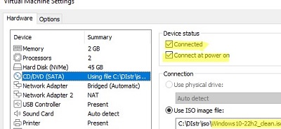 - If you are attempting to boot the VM from an ISO file, make sure that the Connected and Connected at Power On options are enabled in the virtual CD/DVD settings. Check that the path to an existing ISO file containing the operating system installation image is specified in the Use ISO image file parameter. Ensure that the ISO image used to install the guest operating system is not corrupted;