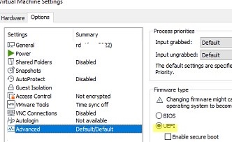 - Open the properties of the VM, go to the Options -> Advanced tab, and check that the VM’s firmware type is UEFI (used by default).
