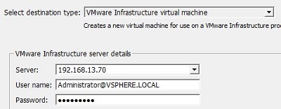 vmware-converter-agent) on it; - Then you will be prompted to specify the name of the ESXi server (or vCenter server), on which the virtual machine will be created, and the credentials to connect;