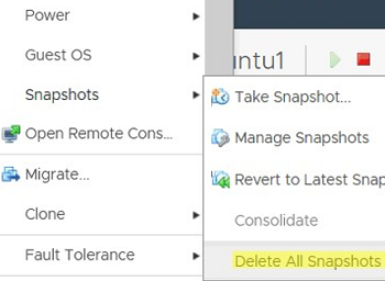 - Remove all the VM snapshots using the ‘Delete All’ option;