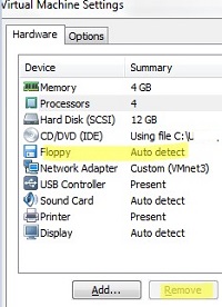 To get rid of the problem, simply remove the virtual floppy drive from the virtual machine’s hardware or disable the Connect at power on option.