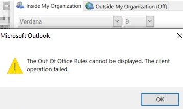 The Out Of Office Rules cannot be displayed. The client operation failed.