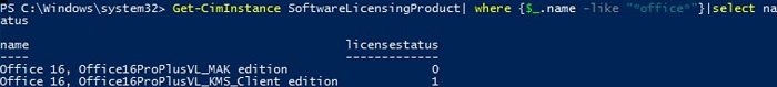 Get-CimInstance SoftwareLicensingProduct| where {$_.name -like "*office*"}|select name,licensestatus