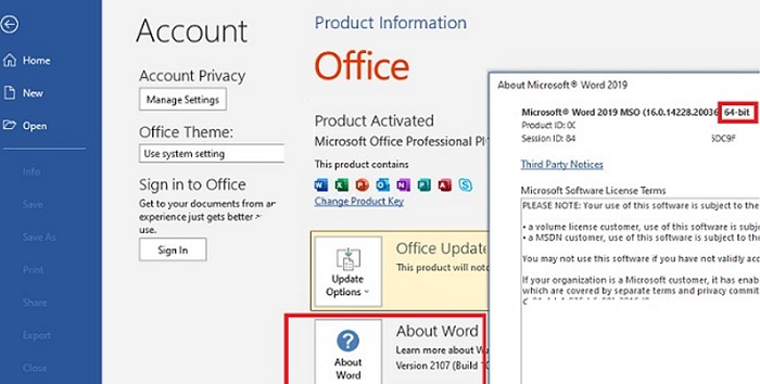 First of all, you need to know the bitness of your Office (32- or 64-bit). To do it, start any Office program (Word, Excel, Outlook) and select File -> Account -> About. The next window will show the bitness of your edition of Office (In our example, this is 64-bit).