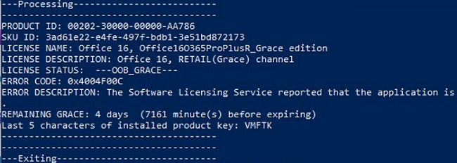 LICENSE NAME: Office 16, Office16O365ProPlusR_Grace edition LICENSE DESCRIPTION: Office 16, RETAIL (Grace) channel LICENSE STATUS:? ---OOB_GRACE--- ERROR CODE: 0x4004F00C ERROR DESCRIPTION: The Software Licensing Service reported that the application is running within the valid grace period.