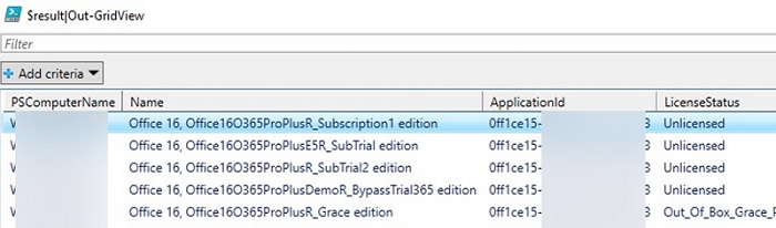 In an Active Directory domain, you can get the activation status of Office on remote computers using a simple PowerShell script. You can create a list of active computers in a specific OU by using the Get-ADComputer cmdlet from the PowerShell Active Directory module. Then you can query the activation status of Microsoft Office licenses for each of them.