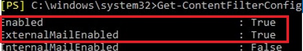 Get-ContentFilterConfig | Format-List Enabled, ExternalMailEnabled, InternalMailEnabled