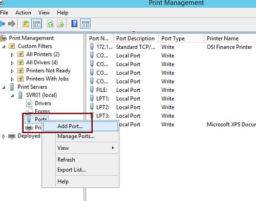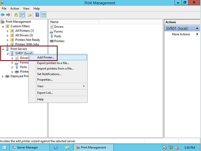 After the role installation is over, open Print Management console and add a new printer (Add Printer…).