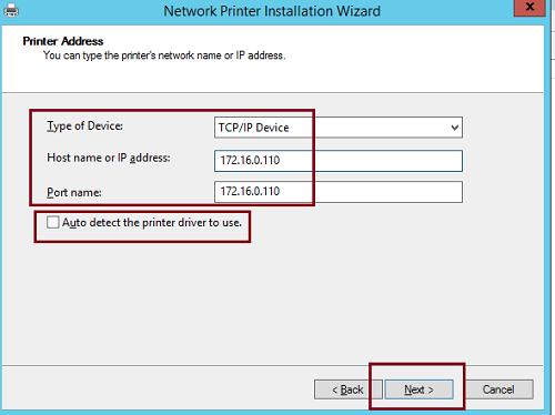 Then select that a TCP/IP printer (TCP/IP Device) is being installed and specify its IP address. Uncheck Auto detect the printer driver to use.