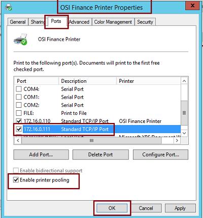 In the Ports tab, check Enable printer?pooling and then check the TCP/IP port created in a previous step in the list of available ports.