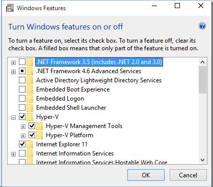 - Hyper-V role has to be installed in Windows 10. (In our case, we had to install Hyper-V Platform first, and then we installed Hyper-V Management Tools)