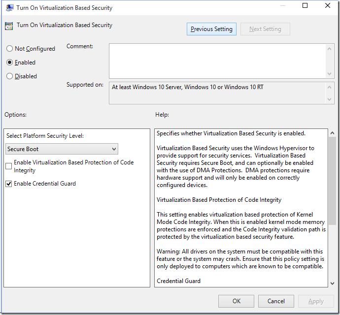 - Virtual Secure Mode (VSM) has to be enabled in a special policy in the Group Policy Editor (gpedit.msc): Computer Configuration -> Administrative templates -> System -> Device Guard -> Turn on Virtualization Based Security. Enable this policy and select Secure Boot option in Select Platform security level. Also check Enable Credential Guard (LSA isolation) here.?