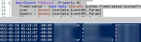 (Get-WinEvent -FilterHashTable @{LogName='Microsoft-Windows-TerminalServices-Gateway/Operational';ID='302'} | Select-Object $properties) -match $rdpusername