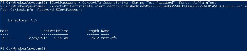 In order to export the generated certificate with a private key to a password-protected PFX file, you need to specify its Thumbprint. It can be copied from the results of New-SelfSignedCertificate command. You also need to specify the certificate’s security password and convert it to SecureString format: