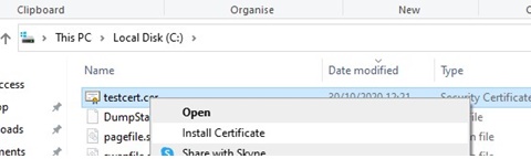 Make sure the *.CER (PFX) certificate file appears in the specified directory. If you right-click it and select the “Install Certificate” menu item, you can use the Certificate Import Wizard to add the certificate to the trusted root certificates on your computer.