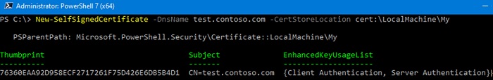 New-SelfSignedCertificate -DnsName test.contoso.com -CertStoreLocation cert:\LocalMachine\My