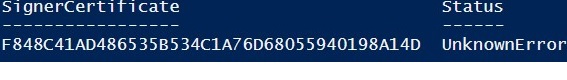 If you are receiving an UnknownError warning when executing the command, this means that the certificate is not trusted, because it is located in the user’s personal certificates store.