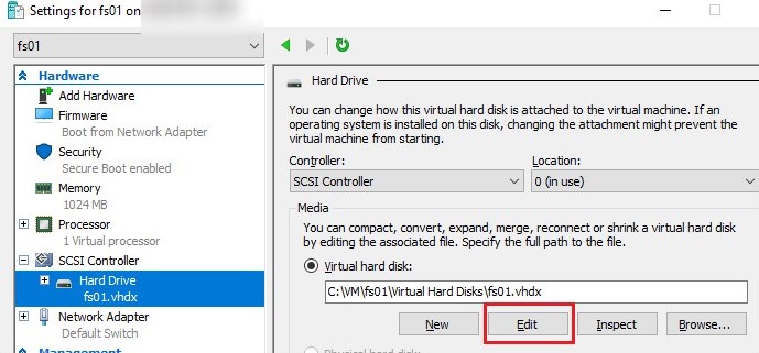 - Select the virtual machine in the Hyper-V virtual machine manager, go to VM Settings -> expand SCSI Controller;