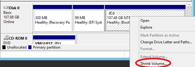 - Before shrinking a virtual disk from the Hyper-V console, it is necessary to reduce the size of the logical partition on the disk inside the guest OS. Free up some space and convert it to the unallocated volume. To do it, open the Disk Manager in the guest OS, select a?volume and click? Shrink Volume;Note.? Shrink Volume option becomes available only if there is some free space on the partition.