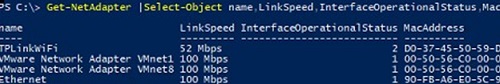 Get-NetAdapter |Select-Object name,LinkSpeed,InterfaceOperationalStatus,MacAddress