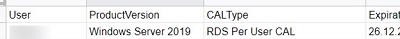 WinRmtDsktpSrvcsCAL 2019 SNGL OLV NL Each AP DvcCAL; - Per-User CAL – is the type of license that allows a user to connect to the RDS server from any number of computers/devices. This type of license is associated with an Active Directory user and issued not permanently, but for a specific period of time. The license is issued for a period of 52 to 89 days (random number). ?The current Open Value license of this type is called