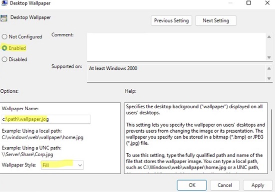 Some GPO settings can have additional parameters that can be configured in the Options section. For example, to set a desktop wallpaper file through a GPO, you need to enable the policy, specify the path to a jpg file in the Wallpaper name field, and select a wallpaper style.
