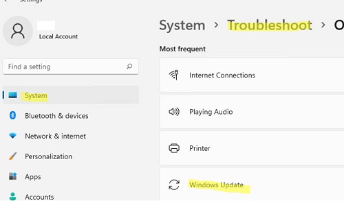 - Windows 11 — Settings -> System -> Troubleshooter -> Other Troubleshooter -> Windows Update;