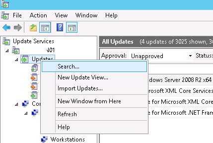 If a corporate WSUS server is used in your company to install updates on a domain computers and servers, you can remove the update approved for install using the Update Services management console. To do it, right-click the Updates branch and then click Search in the menu.