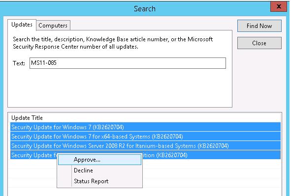 Specify the KB number or a security bulletin you need to find and click Find now. In the list containing the updates that have been found for different Windows versions, select the updates to be uninstalled and click Approve in the menu.